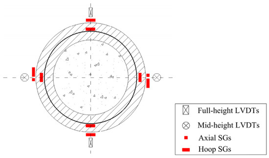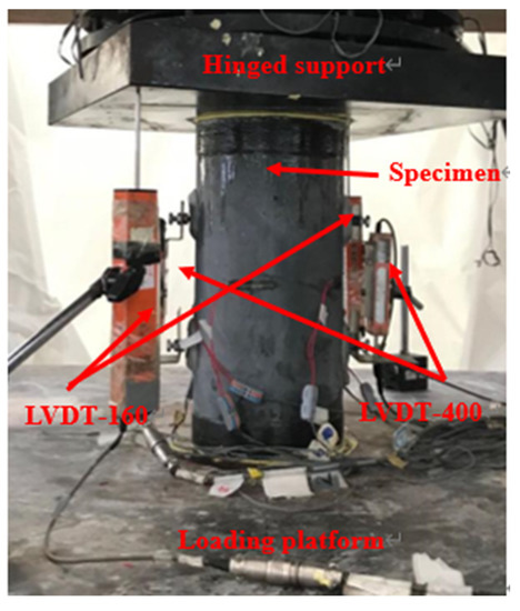 The compression tests were performed at a displacement rate of 0.4 mm/min. Figure 7 shows the instrumentations for the compression test specimens. Ten strain gauges (SGs) with a gauge length of 20 mm were installed for each column. Four SGs in the hoop direction and two in the axial direction were installed on the columns surface at the mid-height of the column. Four SGs were installed on the CFRP grid in the hoop direction. Four LVDTs were adopted to measure displacements. The figure of test set-up is shown in Figure 8.