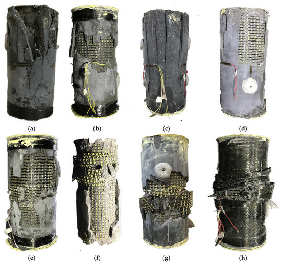 Concrete-filled FRP grid-UHPC tube columns experienced UHPC cracking failure upon the first peak axial load, then the cracks developed, leading to a substantial decrease in axial load. The columns failed finally by CFRP grid failure and UHPC crushing failure (Figure 9e and Figure 10g). Concrete-filled CFRP grid-UHPC tube columns exhibited more severe concrete-cover failure than CFRP grid-UHPC tubular columns because the rupture of the CFRP grid led to an impact action to the UHPC cover of the column. The concrete-filled FRP grid-UHPC tube columns confined with an FRP jacket failed by FRP rupture and CFRP grid-rupture failure (Figure 10h).