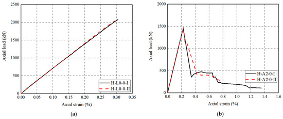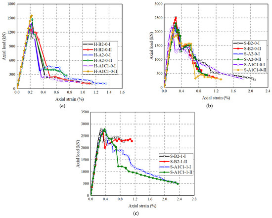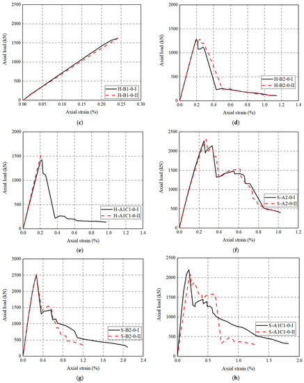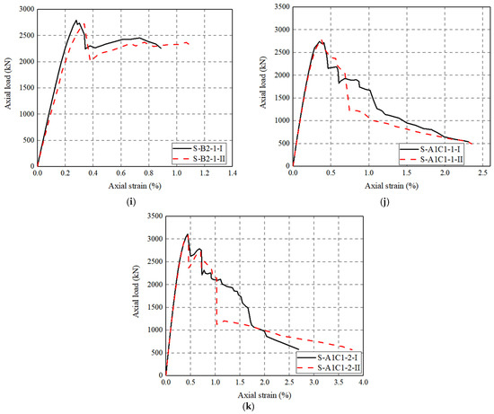 Axial load–axial strain curves of test columns. (a) H-L0-0; (b) H-A2-0; (c) H-B1-0-; (d) H-B2-0-; (e) H-A1C1-0-; (f) S-A2-0-; (g) S-B2-0-; (h) S-A1C1-0-; (i) S-B2-1-; (j) S-A1C1-1-; (k) S-A1C1-2-.
