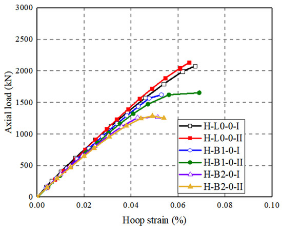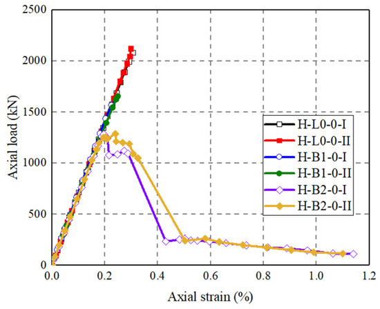 Figure 12 shows that axial load–strain curves of the three groups of CFRP grid-UHPC tubular columns with different numbers of CFRP grid layers. The peak axial load of H-B1-0 is 22.0% lower than that of H-L0-0, the peak axial load of H-B2-0 is 38.8% lower than that of H-L0-0, and the peak axial load of H-B2-0 was 21.6% lower than that of H-B1-0. It can be seen that with an increase in the number of the CFRP grid layers, the peak axial load of the CFRP grid-UHPC tubular column decreases, which is because the CFRP grid is a defect for the axial loaded CFRP grid-UHPC tubular columns in that the FRP grid confinement is not activated, while the situation could be different if the columns are under eccentric compression or bending.