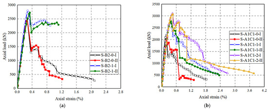 The thickness of the external CFRP wrap has a significant influence on the peak axial load of the columns (Figure 13): the peak axial load of S-B2-1 is 10% higher than that of S-B2-0, the peak axial load of S-A1C1-1 is 29.1% higher than that of S-A1C1-0, and the peak axial load of S-A1C1-2 is 11.9% higher than that of S-A1C1-1.