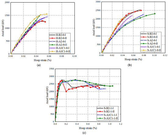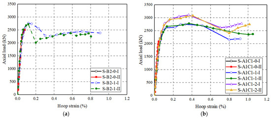 Figure 14b shows the effect of CFRP grid positioning on axial load–hoop strain curves of the concrete-filled FRP-grid UHPC tube columns. It can be observed that the hoop strain of S-B2-0 is smaller than that of S-A2-0 at a given axial load, and the hoop strain of S-A1C1-0 is between those of the formers. For the concrete-filled FRP-grid UHPC tube columns wrapped with CFRP, the curves of the two pairs of specimens basically coincide in the early stage of loading. The effect of the number of CFRP grid layers has little effect on the axial load–hoop strain curves of the FRP-grid UHPC tubular columns (Figure 15). It can be seen from Figure 14 and Figure 15 that the hoop strains in the CFRP grid are small (generally around 800 when the axial strain approached 0.3%). This suggests that the confinement from the CFRP grid is insignificant when the concrete-filled FRP grid-UHPC tubular column failure initiated, explaining why the CFRP grid alone (i.e., without an external FRP jacket) is insufficient in enhancing the strength and deformation capacity of concrete-filled FRP grid-UHPC tubular columns.