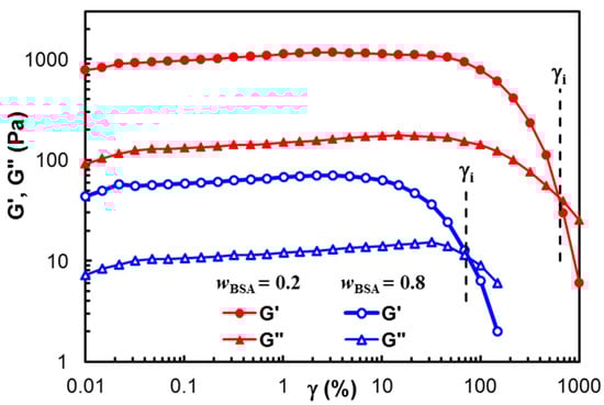 Viscoelastic moduli in amplitude sweep tests for two samples of wBSA = 0.2 and wBSA = 0.8.