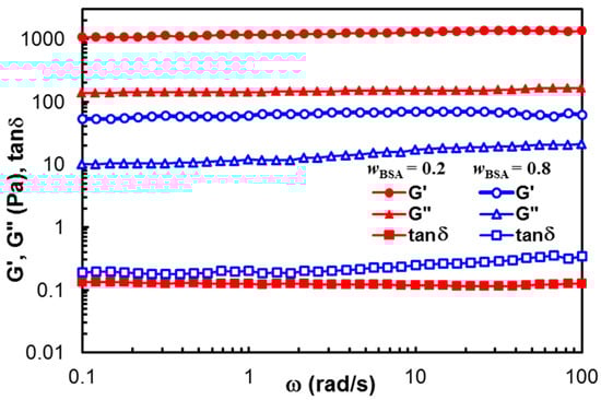 Figure 2 displays the viscoelastic moduli (G′ and G″) and the loss tangent (tanδ) obtained in frequency sweep tests, for the samples of wBSA = 0.2 and wBSA = 0.8. G’ exceeds G″ for each sample, and their values are independent on ω. The stable network structure is registered in both cases, but the polymer content influences the hydrogel strength (G’ being one decade higher for the sample with wBSA = 0.2, as compared with those of wBSA = 0.8). For wBSA = 0.8, a slight increase in G″ with increasing ω is observed in Figure 2. Similar behavior was detected for wBSA = 0.9. From a rheological point of view, a small value of the slope for the G″ vs. ω dependence (tanδ < 1) suggests the existence of a weak network.