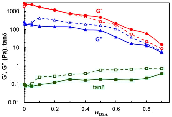 The dependences of G′, G″ and tanδ on the polymer/protein composition are given in Figure 3 (the values at ω = 1 rad/s were considered). The viscoelastic moduli slowly decrease with increasing BSA content for wBSA < 0.5, and their diminution is more pronounced for wBSA > 0.5, suggesting that polymer-polymer interactions contribute to the hydrogel strength. A synergistic effect was achieved by combining the polymer mixture with different amounts of BSA. Even the protein addition weakens the hydrogel moduli; the loss tangent, expressing the degree of viscoelasticity of the sample, remains nearly constant over a large range of the composition, especially at 37 °C.