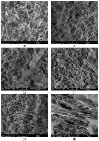 SEM micrographs of lyophilized hydrogels with different wBSA: (a) 0; (b) 0.1; (c) 0.2; (d) 0.5; (e) 0.8; (f) 0.9.
