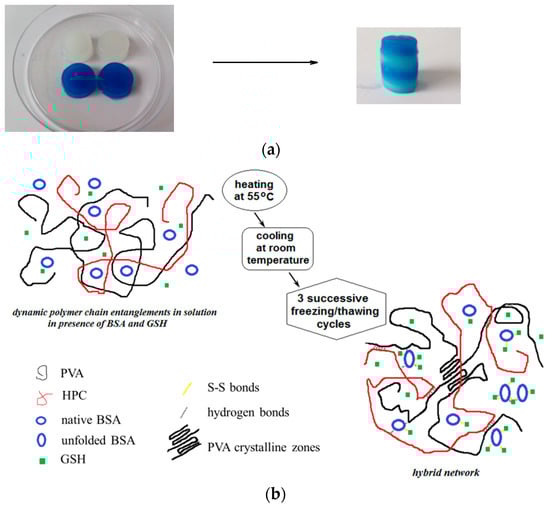 PVA, in combination with BSA and hydroxypropylcellulose (HPC), in the presence of GSH, was recently used to prepare porous hydrogels by the freezing/thawing method. It was found that the obtained physical networks have high hydrophilicity and swelling capacity in solution []. In this paper, double protein/polymer networks are prepared. The physical hydrogels are formed by S-S interactions of unfolded BSA in the presence of GSH, and then PVA junction points resulted by applying successive freezing/thawing cycles. The entire range of the polymer/BSA composition was explored, and the self-healing ability was investigated in different conditions of deformation and temperature.