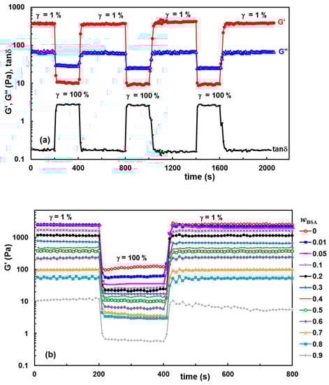 The self-healing ability of the hydrogels was confirmed by dynamic rheological analysis, by analyzing the thixotropy of the samples in oscillatory shear conditions. Figure 6a reveals as an example the changes in viscoelastic parameters of hydrogel with wBSA = 0.5 which was submitted alternatively to several cycles of low (1%) and high (100%) step strains. Figure 6b presents the data obtained for G′ using samples with a different BSA content which were submitted to alternatively 1%–100%–1% step strains.
