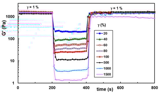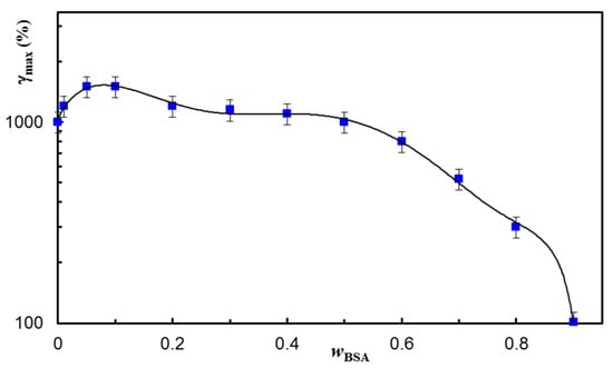 The self-healing ability was also tested at increasing strain values applied in the second step of the thixotropy test (Figure 7), and the results were satisfactory for a large range of applied strains. The maximum strain at which the network structure is preserved depends on the BSA content in the network (Figure 8). A synergistic behavior is observed for a small content of BSA (wBSA in the range of 0.05 to 0.1), when the structure is recovered in time for γ ≤ 1500%.