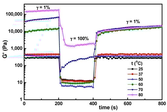 In the present investigation, the main interest was to conserve the structural integrity of the hybrid hydrogels during their storage and use. After 3 months, a very good stability was observed for samples with wBSA ≤ 0.7 kept at room temperature. For a higher content of BSA, the mass loss increased in time. The effect of temperature was tested for the hydrogel sample with wBSA of 0.5 submitted to successive step strains of 1%–100%–1% (Figure 9). The structure is recovered almost completely for the temperature range from 25 °C to 50 °C, which covers the range of interest for biomedical applications. At higher temperatures (above 60 °C), there is an important increase in G′ values, and the self-healing ability is lost, even by decreasing the temperature to 37 °C (Figure 10). The PVA-PVA interactions become weaker, and at 80 °C they vanish. The protein being denatured, the sample structure is mainly controlled by the BSA-BSA or BSA-GSH disulfide bridges and HPC hydrophobic interactions. After applying a step strain of 100%, the sample was not able to recover the rest structure. It can be observed that the structural integrity and functionality are preserved only below 50 °C. For such hybrid materials, high temperatures must be avoided if the self-healing property is required. If the sample is heated above 70 °C, the network formation by the unfolding BSA macromolecules advances further due to the association phenomena, but the intermolecular β-sheet development is irreversible [].