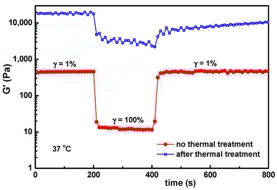 The influence of the thermal treatment (sample kept at 70 °C for 1 h and then cooled to 37 °C and thermostated for 1 h) on the self-healing behavior of the hydrogel with wBSA = 0.5.