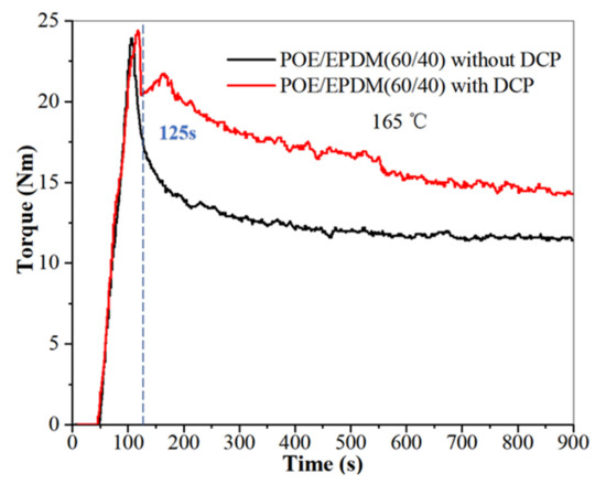 Variations of torque of POE/EPDM blends with and without DCP at 165 °C in a torque rheometer.