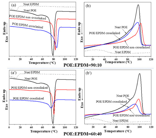 DSC cooling (10 °C/min) thermograms and the subsequent melting (10 °C/min) thermograms of neat POE, neat EPDM, dynamic crosslinked POE/EPDM, and non-crosslinked POE/EPDM: (a,a′) cooling thermograms; (b,b′) the subsequent melting thermograms. Crosslinked blends show lower melting temperature, indicating that the crystals are smaller.