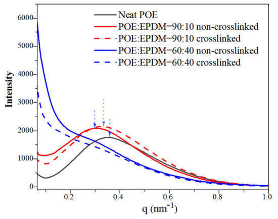 As shown in Figure 3, neat POE (black line) exhibited a main well-defined scattering peak around q at 0.37 nm−1, corresponding to the fringed micellar crystals of neat POE. For the blend with 10 wt% EPDM, the characteristic scattering peaks still exhibited good shape, but shifted to a lower peak position, indicating that the addition of a small amount of EPDM enlarged the inter-distance of POE micellar crystals. Therefore, it can be inferred that a small amount of EPDM can enter the phase region of POE, and hence enlarge the spacing of POE micellar crystals. On the other hand, after dynamic crosslinking, the scattering peak of the blend shifted back to a higher peak position, indicating a smaller average inter-distance. After crosslinking, it can be seen from the melting traces in Figure 2b that the melting point of the blends decreased, indicating that smaller crystals were formed. Therefore, the inter-distance of neighboring crystals becoming smaller after crosslinking is presumably caused by the crystal fragmentation after crosslinking.