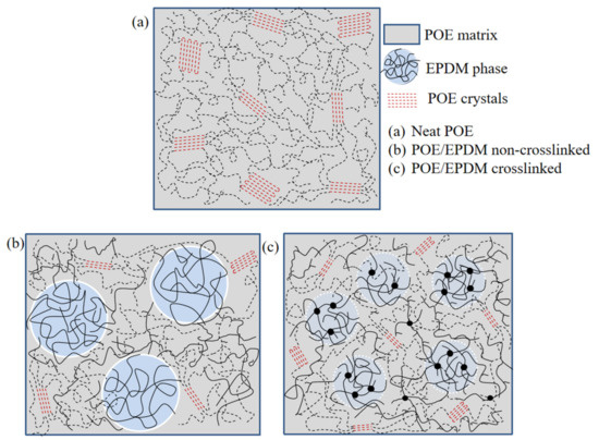 Ethylene-octene copolymerized elastomer is a synthetic thermoplastic elastomer [1,2] with a significant narrow molecular weight distribution and six-carbon short-chain branches [3,4,5]. Ethylene in the copolymer can be crystallized, and this part of crystallization serves as a physical crosslinking point to provide material strength [6,7,8]. The amorphous portion of the random ethylene-octene segment contributes to the elasticity [6,9]. Its flexibility and mechanical properties, like synthetic rubber, combined with the melt processability, make the ethylene-octene elastomer a very good material with many industrial applications [10,11,12,13,14]. However, its large permanent deformation and other disadvantages limit its application. In certain applications, EPDM is commonly used to improve the elasticity or toughness of plastic materials [15,16]. EPDM has been blended with POE to improve the properties of POE. For EPDM/POE blending, substantial studies have been carried out on the mechanical properties and the crosslinking methods [15,16,17]. Modified POE with crosslinked EPDM using the dynamic crosslinking method [17] can obtain good mechanical properties. The processing procedures are the same as the ones used to prepare PP/EPDM thermoplastic vulcanizates (TPV).