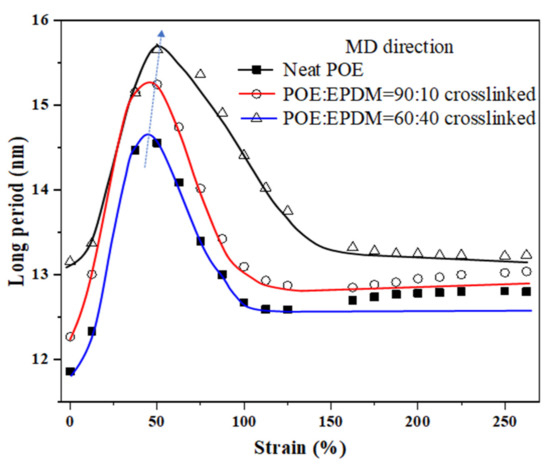 The “long period” is used to represent the change in the averaged inter-distance of neighboring crystals in the sample, which can be quantitatively evaluated from the Lorentz-corrected SAXS profiles of the sample [27]. It can be seen from Figure 6 that in the stretching direction, the long period first increased with strain and then decreased, indicating that when the strain continued to increase, large crystals were fragmentated. Besides, the new crystals were formed at about 100-125% strain, as shown in Figure 6, which is in accordance with the “11” scattering pattern in Figure 5. Finally, the long period in Figure 6 was stable. Compared with neat POE, with an increase in strain, the maximum value of the long periods for the blends with 10 wt% EPDM and 40 wt% EPDM appeared at higher strains (53% and 69% strain, respectively) than for neat POE, indicating that crosslinked EPDM can hinder the damage of crystals, leading to the crystals being fragmentated later. The above result indicates that crosslinked EPDM hindered the destruction of crystals and led to the delayed destruction of crystals.