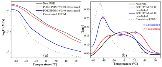 Storage modulus (a) and tan δ (b) of neat POE and dynamic crosslinked POE/EPDM blends.