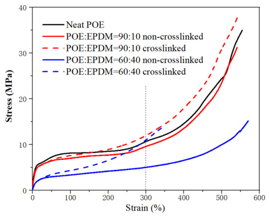 The stress-strain curves of the POE/EPDM blends during uniaxial deformation are shown in Figure 8. It can be seen from Figure 8 and Table 3 that the elongation at break of non-crosslinked blends did not decrease compared to neat POE, despite the phase separation structure of POE and EPDM existing, as discussed in above SAXS result, indicating that the phase interfaces between POE and EPDM were good (Figure 3). The tensile strength of the 10 wt% and 40 wt% EPDM blends was 31.3 MPa and 15.2 MPa, respectively, and both were lower than neat POE (34.9 MPa), which was a result of the lower strength of the EPDM rubber.