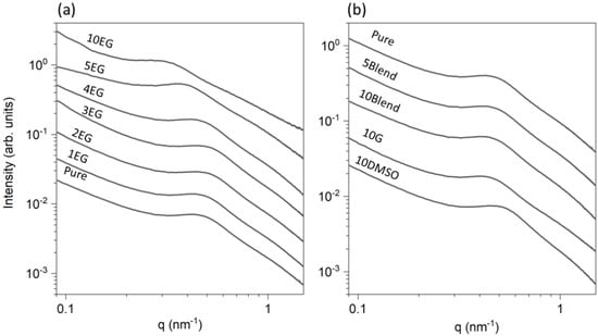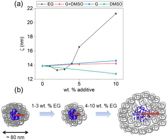 In the case of G, it seemed to follow a similar behavior as EG. However, the effect was less pronounced (Figure 4a, blue data). In the case of DMSO, the trend of ξ exhibited a slight decrease upon the addition of 10 wt% DMSO. For similar concentrations, Murphy et al. reported almost no change in the SAXS profile, and Bagchi et al. reported an increase of ξ but for much larger concentrations of DMSO.