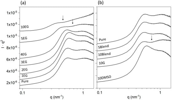 For the PEDOT:PSS dispersion with 5 and 10 wt% EG (Figure 2a), the q* values can be estimated as being around 0.62 nm−1 and 0.42 nm−1 respectively. These values correspond to persistence lengths of a~3 nm and 4.5 nm, respectively. The SAXS profile of the sample with 10 wt.% G (Figure 2b) also showed an upturn for q > 0.75 nm−1 (a~2.5 nm). Interestingly enough, DMSO (Figure 2b) seemed to induce the opposite effect than EG and G, compensating the effect of G in the samples with the blend G+DMSO.
