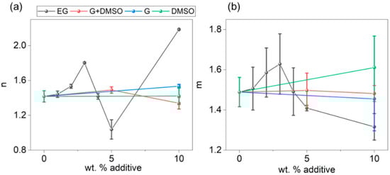 The increase of n at low EG concentrations can be associated with the presence of denser aggregates in the dispersions. As above discussed, a reduction of m can be attributed to a transition from a coil-like chain conformation to a more rigid one in the dispersion [,]. The fitted data from dispersions with EG and G support this behavior. These results are in line with those extracted from Kratky plots concerning the addition of EG to the PEDOT:PSS aqueous dispersion (Figure 2a). A similar conclusion can be suggested for PEDOT:PSS dispersion with G, supporting that the differences can be associated with the high polarity of G. This solvent should interact more efficiently with the charged segments of PSS and PEDOT []. Thus, the screening of the Coulombic force would induce a more-extended chain conformation. On the contrary, DMSO seems to affect the PEDOT:PSS dispersion at both the interchain and nanometer distance level as derived from Kratky plots analysis (Figure 2b) but not remarkably affecting the PEDOT:PSS grain structure.