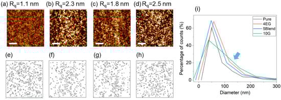 (a–d) AFM topographical images obtained in tapping mode with their corresponding roughness value: (a) pristine PEDOT:PSS, (b) PEDOT:PSS with 4 wt% EG, (c) PEDOT:PSS with 5 wt% (G+DMSO) and (d) PEDOT:PSS with 10 wt% G. (e–h) AFM height images after particle analysis processing. (i) Distribution of grain diameters analyzed by particle analysis plug-in of ImageJ software, version 1.53e.