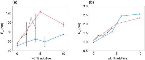 The thickness of pure PEDOT:PSS thin films is roughly 50 nm. The incorporation of EG increased the thickness, although the film became irregular, as reflected by the size of the error bars. Higher concentrations than 4 wt% formed discontinuous films. When blended with G or G+DMSO, the thickness also increased as a general trend, although it decreased at 10 wt% of G+DMSO. As previously mentioned, the higher the additive concentration, the rougher the surface (Figure 6b).