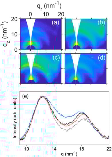 The additive effects on the structure of PEDOT:PSS thin films were elucidated by GIWAXS. Figure 7a–d shows GIWAXS patterns from selected samples. The pattern of pristine PEDOT:PSS (Figure 7a) and with additives (Figure 7b–d) presented the same reflections at q = 12.5 nm−1 and q = 18.2 nm−1. The first one comes from amorphous PSS, although other works refer to the π-π stacking of PSS []. The one at q = 18.2 nm−1 is associated with the π-π stacking of PEDOT segments [].
