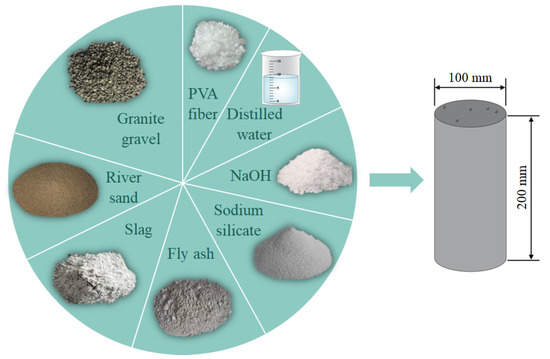 Four groups of axial compression test specimens and the corresponding 10 mixed proportions are shown in Table 2, based on the properties of materials and some try–tests. The specimens are numbered according to the fly ash mass ratio and PVA fibers volume ratios as experimental research parameters. For convenience, in this paper, the fly ash mass ratio is indicated by mt.%, while the volume ratio of PVA fibers is indicated by vol.%. For example, F40-P0.6 represents a sample with 40 mt.% fly ash and 0.6 vol.% PVA fiber. The static axial compression specimen, as shown in Figure 1 is with a diameter of 100 mm and a height of 200 mm according to ASTM C469 [42]. The process of preparing the specimen is as follows: (1) the weighed dry granite gravel, river sand, fly ash and slag were poured into the mixing pot, mixed for 8 min; (2) put PVA fibers into the mixing pot and added activator solution and water. Mixing was continued for 12 min to ensure the uniform dispersion of fibers. Note that when adding the fibers, kept the machine mixed. (3) Poured the concrete into the 100 × 200 mm molds, gently vibrated them several times, and then removed bubbles in the cement mortar vibration table; (4) demold after curing 24 h, and then covered with plastic wrap to continue curing to the target age in the room environment.