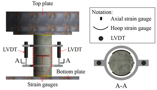 Axial compression tests were carried out to verify the effect of ratios of PVA fibers and fly ash on the compression performance of the PFRGCs. The axial compression test setup is shown in Figure 2. Displacement loading mode with a rate of 0.18 mm/min is adopted on the axial compression specimens by a MATEST-5000 kN voltage servo testing machine referred to the Standard Test Methods for Fiber Reinforced Concrete (CECS 13–2009) [43] and Standard Test Mothed for Compressive Strength of Cylindrical Concrete Specimens (ASTM C39) [44]. The specimens were levelled with high-strength gypsum to ensure the axial compression load [45,46,47]. Axial strains and hoop strains of the middle height of the samples, as shown in Figure 2, were collected at a frequency of 1 Hz by the TDS-530 static acquisition instrument and measured axial deformations with two linear variable differential transformers (LVDTs) to ensure effective axial deformation measurements with the failures of strain gauges during the loading [48,49,50].