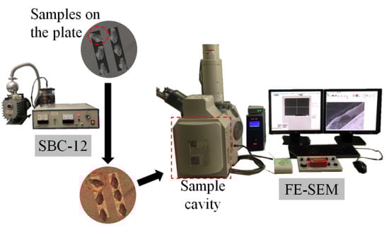 To analyze the microscopic mechanism of the effect of PVA fibers and fly ash on the axial compression performance of the PFRGCs, Hitachi S-3400N were used to observe and analyze the microstructure of the damaged samples, as shown in Figure 3, as shown in Figure 3. The Hitachi S-3400N is a field emission-scanning electron microscope (FE-SEM), which can carry out high-resolution imaging and specimen morphology research from nanometer to millimeter. Specimens of the SEM test were chosen and cut from the specimens after axial tests. The specimens of SEM tests were kept dry, and gold iron was injected by an SBC-12 iron sputtering instrument before observation in the SEM cavity.