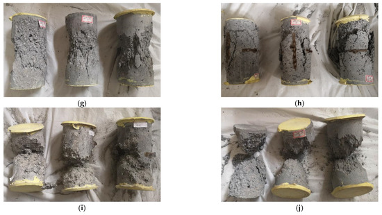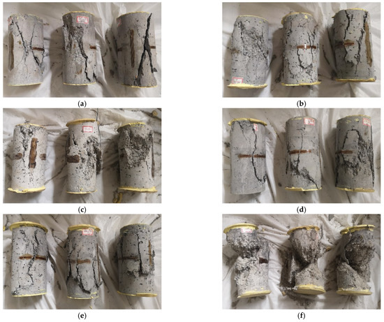 Failure modes of the PFRGCs with different ratios of PVA fibers and fly ash are shown in Figure 4. The failure process of specimens without PVA fibers is divided into the following stages: (1) micro-deformation stage, micro-deformation occurred in the axial and hoop directions. Tiny micro-cracks appeared at the weak points in the concrete matrix. (2) Cracks propagation stage, with the increasing load, the micro-cracks became longer and wider, and the concrete on the surface began to collapse and peel off. (3) Specimen failure stage, the micro-cracks in the concrete grew and connected, and the micro-cracks grew into large cracks that run through the whole specimen, resulting in the overall failure of the specimen. Finally, the specimens were crushed into 2~4 pieces (Figure 4a,d,g,j), showing typical brittle failure of ordinary concrete. Unlike GCs, with adding PVA fibers, visible protrusions can be seen in the middle of the PFRGCs, and the specimens showed a multi-cracking characteristic and ductile behavior (Figure 4b,c,e,f,h,i). The loading time of specimens with PVA fibers is longer, and the development speed of surface cracks of specimens with PVA fibers is slower than that of GC. With the increase of axial load, the number of cracks increased, and the fibers in the cracks were broken or pulled out. Although the surface of the specimen is flabby, there is no peeling phenomenon, and the integrity is good. The addition of PVA fibers changed the original brittle failure mode of GCs.