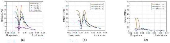Figure 5 shows the typical axial stress–hoop strain curves and axial stress–axial strain curves of PFRGCs under different mixed proportions. The axial strains in Figure 5 were based on the average readings of two LVDTs. The specimens experienced considerable deformation in the later loading stage, which made the axial deformation monitored by SGs unreliable. For convenience, axial stress–hoop strain curves and axial stress–axial strain curves are called stress–strain curves in this paper. The axial stress–axial strain curves were terminated at around 20% of the peak load, and axial stress–hoop strain curves terminated at the peak load. As shown in Figure 5, the axial stress–axial strain of PFRGCs can be divided into four stages: (1) Linear elastic state. From the beginning of loading to about 30% of the peak stress, the micro-cracks of the specimens hardly initiate. (2) Strain softening state. The micro-cracks of the specimens begin to expand and increase, which leads to a stiffness decrease of the PFRGCs with the increasing loading. (3) Rapid decrease stage. The compressive strength of the PFRGCs rapidly decreases as the cracks expand more quickly and the crack width increase. (4) Convergence state. In this stage, due to the bridging effect of the fiber, the PFRGCs can still bear a certain compression load with large deformation. According to the stress–strain curves of the test specimens, test results including compressive strength, ultimate strain, elasticity modulus and Poisson’s ratios are shown in Table 3.