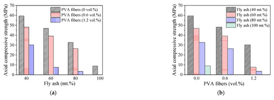 The effects of ratios of PVA fibers/fly ash on the axial compressive strength of PFRGCs with the same ratios of fly ash/PVA fibers are shown in Figure 6. The effect of PVA fibers volume ratio on the axial compressive strength of PFRGCs is shown in Figure 6a. It can be seen in Figure 6a, with the same fly ash mass ratio, the compressive strength of the specimens decreases with the increasing PVA fibers volume ratio. The compressive strength of PFRGCs with 0.6 vol.% PVA fibers is 16.5–19.8% lower than that of PFRGCs without PVA fibers (Figure 6a). With the same PVA fibers volume ratio, the influence of different fly ash mass ratios on the compressive strength of PFRGCs is shown in Figure 6b. Under the condition of three volume ratio of PVA fibers (0 vol.%, 0.6 vol.%, 1.2 vol.%), the compressive strength of PFRGCs decreases with the increasing fly ash. When the volume ratio of PVA fibers is 0 vol.% and 0.6 vol.%, the compressive strength of the specimens decreases nearly linearly with the increasing fly ash.