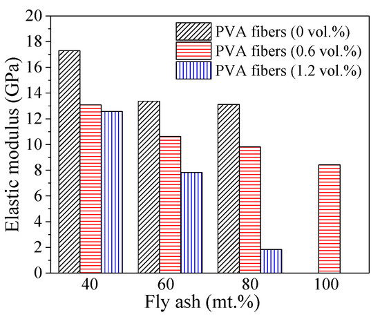 Figure 7 shows the elastic modulus of PFRGCs. It can be observed that the elastic modulus of PFRGCs decreases with the increasing PVA fibers at a given mass ratio of fly ash. Among them, PFRGCs with 40 mt.% fly ash and 0 vol.% PVA fiber shows the highest elastic modulus of 17.3 GPa. The influence of PVA fibers on elastic modulus is mainly manifested in two aspects: (1) the incorporation of PVA fibers reduces the strength of PFRGCs, and the specific reasons have been analyzed above; (2) fibers inhibit the initiation and development of cracks, and thus improve the ductility of PFRGCs. When the fly ash mass ratio and PVA fibers volume ratios are 80% and 1.2%, respectively, the PFRGC has the lowest elastic modulus of 1.84 Gpa. As shown in Figure 7, the elastic modulus of PFRGCs decreases with the increasing fly ash at a given volume ratio of PVA fibers. The reason is that the increase of fly ash reduces the strength of PFRGCs, and the specific reasons have been analyzed above. The elastic modulus of PFRGCs with 80 mt.% fly ash is 51.4% lower than that of PFRGCs with 40 mt.% fly ash content.