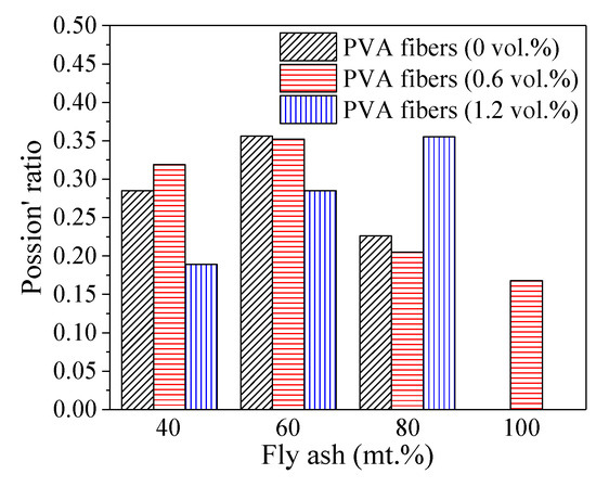 - When the mass ratio of fly ash is 40% and 60%, the Poisson’s ratio of PFRGCs first increases and then decreases with the increasing PVA fibers. The Poisson’s ratio of PFRGCs increases first and then decreases with the increasing fly ash when the volume ratio of PVA fibers is constant, except that the volume ratio of PVA fibers is 1.2%.