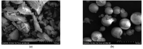 Figure 9 reveals the SEM photos of slag and fly ash used in this test. Slag powder is irregular flaky, or blocky (Figure 9a) while fly ash is spherical (Figure 9b). Calcium oxide accounts for a large proportion of the chemical composition of slag, so PFRGCs prepared from blast furnace slag as the primary raw material has high early strength. Because of the spherical characteristics, fly ash can improve the fluidity of concrete materials when preparing concrete, but the spherical structure has a negative impact on concrete materials.