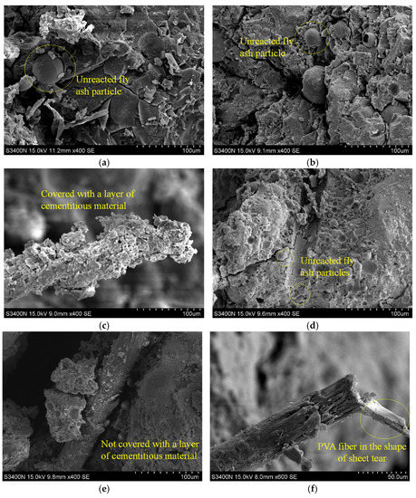 Figure 11 shows the SEM photos of PFRGCs with a different volume ratio of PVA fibers under the same ratio fly ash. Comparing Figure 11a,b,d, it can be known that the number of unreacted fly ash particles in PFRGCs increases with the increase of PVA fibers. This phenomenon shows that the increase of PVA fibers content affects the alkali-activated reaction. Although PVA fibers have been pulled out from the matrix of PFRGCs, the surface of PVA fibers is still covered with a layer of cementitious material (Figure 11c). Comparing the PVA fiber micrographs in Figure 11c,e, it can be found that the PVA fibers of F40-P0.6 are better combined with the matrix than of F40-P1.2. Figure 11f is a microscopic image of PVA fibers after breaking. It can be seen that the fracture of PVA fibers is in the shape of sheet tear, which indicates that the PVA fibers bridging the surface of the cracks in PFRGCs consume energy when it is pulled out and broken.