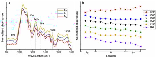 (a) FT-IR spectra of fiber sheath extracted from Bg to By; (b) Change in relative intensity of absorbance bands for fiber sheath from Bg to By.