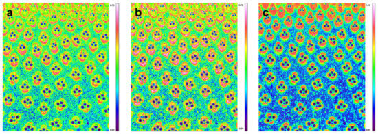 Previously, the investigation of carbohydrate and lignin in the bamboo cell wall mainly focused on the total value of lignin in bamboo tissues, comprising all tissues, such as fibers, vessels and parenchyma, rather than specifying the lignin and values for individual cell types [,,]. Actually, the extent of compositional variation was found to be influenced by the age of the culm, in certain ages by the position of the vascular bundle, and most strikingly, by the proportion of fibers within the vascular bundle and surrounding parenchyma. The FT-IR microspectroscopic data can be displayed as chemical images at specific wavelengths at the tissue level with a spatial resolution near 6.25 µm (Transmission mode). Figure 2 shows the functional group chemical images of bamboo culm transverse sections. The red color represents high intensity and the blue color stands for little or no intensity. Thus, chemical images at bands near 1730, 1508, and 1240 cm−1 can show the relative concentrations of xylan, lignin, and cellulose, respectively. The chemical images indicated that the xylan (Figure 2a) and lignin (Figure 2b) mostly accumulated in the fiber sheath within the vascular bundles and appeared much less in the ground parenchymatic regions. This is to be expected, because the vascular bundles are believed to be the main mechanical support for the whole bamboo culm. Interestingly, for a single vascular bundle, there is also a heterogeneity in compositional distribution. High lignin and xylan concentration was visualized in the outermost part of the fiber sheath. Comparatively, cellulose showed a more homogeneous distribution pattern for the fiber sheaths within the vascular bundles (Figure 2c). It has been revealed that the average tensile modulus for the bamboo fiber is three times higher than that of the parenchyma []. Cellulose has been proved to be the main structural component and has remarkable mechanical properties. Thus, the higher concentration of cellulose in the fiber sheaths area may partly explain the superior modulus and strength properties compared with parenchyma cells.