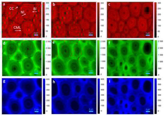 By integrating over the CH and CH2 stretching vibrations (2800 cm−1 to 2918 cm−1), high intensity and thus high carbohydrates concentration were observed especially in the secondary wall (SW) of fiber (Figure 3a–c). Due to the high spatial resolution, the alternating broad (Bl) and narrow layers (Nl) can be easily differentiated in the polylamellate secondary walls, with the Bl having higher carbohydrates concentration than the Nl. Raman image by calculating the band ranges from 1540 cm−1 to 1660 cm−1 displayed the heterogeneity in lignin distribution. As shown in Figure 3d–f, lignin concentration was the highest in cell corner (CC) and compound middle lamella (CML). Within the SW, the lignin concentration decreased from the outer layer to the cell lumen, with relative higher concentration in the lumen edge as well as the interface between adjacent layers of the multilayered fiber.