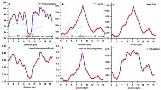 Raman line scan of Bg fiber wall, (a) Carbohydrates; (b) Lignin; (c) HCA; (d) Carbohydrates to lignin ratio; (e) HCA to carbohydrates ratio; (f) HCA to lignin ratio.