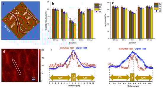 As shown in Figure 6a–c, the mean value of indentation modulus and hardness of bamboo fiber within a single fiber wall, displayed an obvious difference. The outer layer of fiber SW in all the Bg, Bt and By areas has higher modulus (19.59–20.31 GPa) and hardness (428–445 MPa) than the inner layer of fiber close to the lumen area with modulus of 17.07–19.99 GPa and hardness of 410–440 MPa. Although previous studies suggested that the microfibril angle is negatively correlated with the elastic modulus of fiber cell wall [,], the Raman spectral analysis result revealed a relatively uniform cellulose orientation distribution in the multilayered fiber by extracting the cellulose orientation sensitive band around 1097 cm−1 (Figure 6d). This result is consistent with the earlier typical microfibril angle model of multilayer fiber by Parameswaran & Liese []. Thus, the variation in the modulus was mainly due to the variation in the cell wall lignification level and its composition, which has been confirmed by lignin Raman line scan (Figure 5b). Similarly, in the spruce tracheid wall, the observed difference in the modulus of elasticity between developing and fully lignified cell walls is due to the filling of spaces with lignin and an increase in the packing density of the cell wall during lignification [].