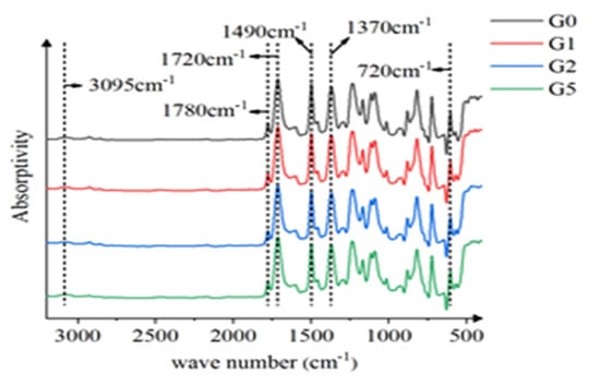 In this paper, the infrared absorption spectra of the samples were measured by American Thermo Fisher Nicolet using the five Fourier transform infrared spectrometer, and different functional groups were determined to characterize their microstructure. The spectral range used is 4000–400 cm−1, and the infrared spectra of G0, G1, G2, and G5 are shown in Figure 3.