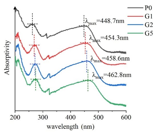 We used the Shimadzu (UV3600) ultraviolet visible spectrophotometer (UV-vis) to test the structural characteristics and charge transfer complexation (CTC) of the sample. The ultraviolet visible spectrum of 200~600 nm is shown in Figure 4.