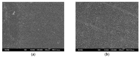 The JSM-6700F scanning electron microscope (SEM) was used to observe the surface and section morphology of the sample. The surface of the film after gold spraying was enlarged by 40,000 times, as shown in Figure 5, and the section was enlarged by 20,000 times, as shown in Figure 6.