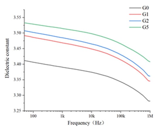 The dielectric properties of the samples were tested using the Novocontrol dielectric constant tester. The dielectric response of the polyimide film after gold spraying was tested 10 times at 25 °C in the frequency range of 50 Hz–1 MHz. The average value of 10 tests of each sample was taken as the final test result, and the values of the dielectric constant as well as the dielectric loss tangent are shown in Figure 7 and Figure 8, respectively.