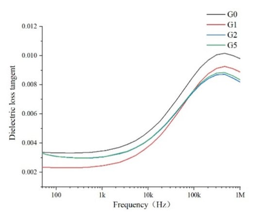Except for conductivity loss, the dielectric also has periodic relaxation polarization related to thermal motion under an alternating electric field. As the conductivity of the polymer dielectric is quite low, the dielectric loss tangent is often used to characterize the dielectric loss characteristics of materials. It can be seen in Figure 8 that the dielectric loss characteristics of the four samples are slightly different in the low frequency region and greatly different in the high frequency region. With the increase of frequency, the tangent value increases continuously in the range of 50 Hz to 1 MHz and decreases slightly in the later stage, and the tangent of the frequency dielectric loss increases slowly in the low frequency range. This is because the dipole can keep up with the change of electric field in the low frequency region, so the dielectric loss is low. With the increase in frequency, the polarization cannot keep up with the change of electric field in the high frequency region, and the dipole steering is affected by resistance, leading to the increase in dielectric loss [10]. When the frequency is much too high, the relaxation polarization is too late to be established, and the displacement polarization is the dominant one, thus the maximum value appears. For the four samples, in the high-frequency range (1 kHz ~ 100 kHz), the addition of GAPD leads to an obvious reduction of dielectric loss, this is because the addition of GAPD causes an increase in polymer crystallinity, which is conducive to the polarization steering of dipole to reduce the heat generation caused by resistance under an alternating electric field.