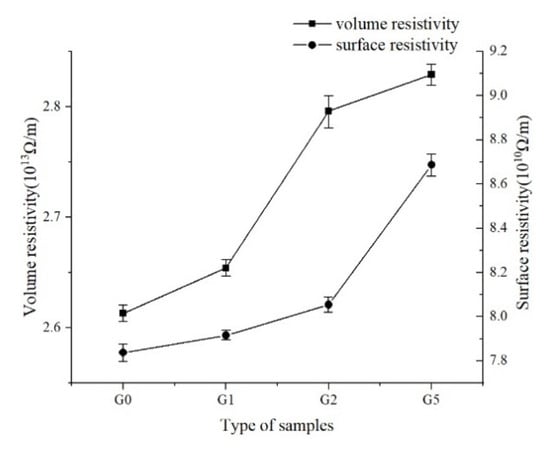 According to the standard IEC60093-1980<Methods of test for volume resistivity and surface resistivity of solid electrical insulating materials> [11], the volume and surface resistivity of the polyimide film were tested with the American Keithley 6517B megger and the 8009 three electrode fixture. Before the test, the insulating material should be electrically aged for 1 min and the indication should be read after it is stable. The test results are shown in Figure 9.