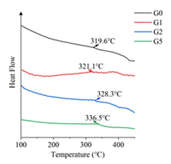 Tg is not only the lowest temperature, but also the upper limit of working temperature for the free movement of amorphous polymer macromolecular segments. The increase of Tg after adding GAPD is due to the fact that the addition of GAPD will affect the free movement of polymer macromolecules, strengthening the charge transfer complexation, and enhancing the intermolecular force, which makes it more difficult for the polyimide molecular chain to convert into a state of free movement.